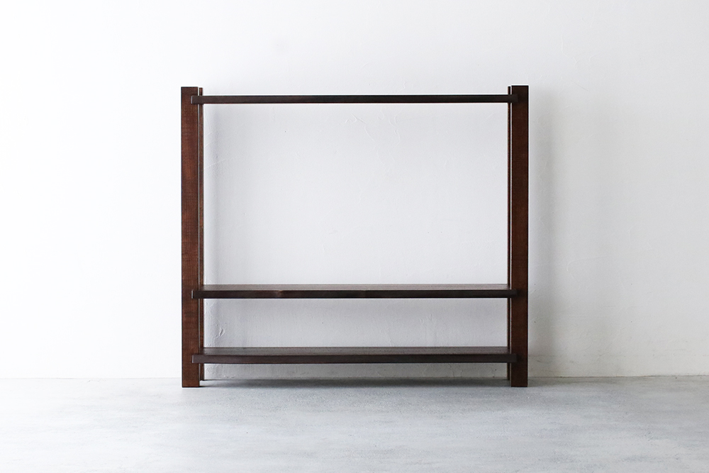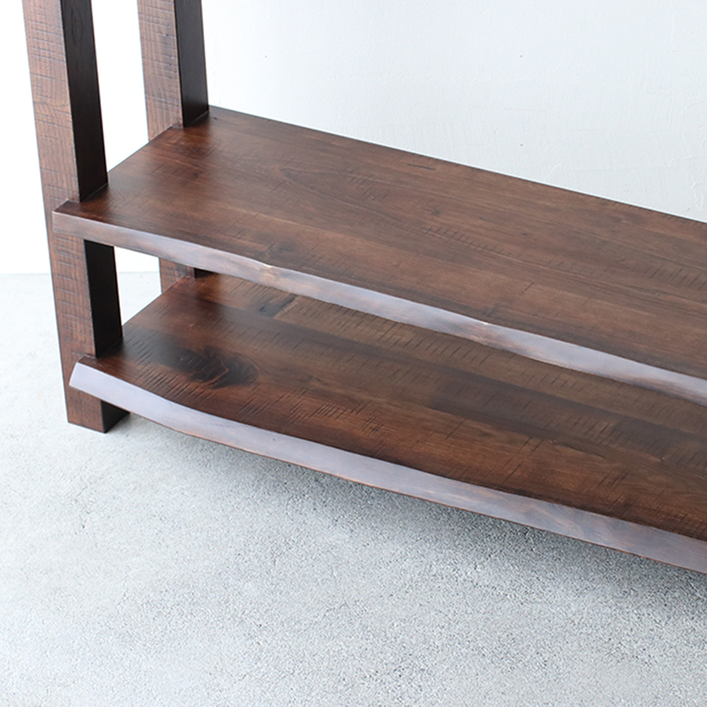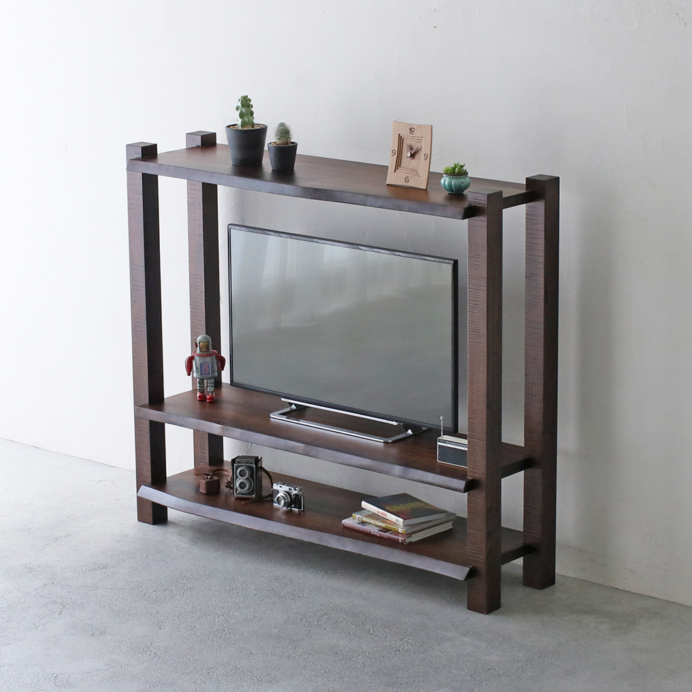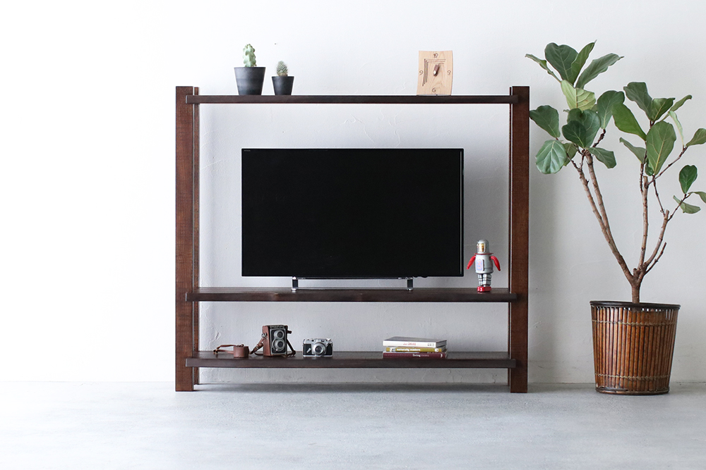 大型テレビを置いても動じない分厚い棚板を3カ所に配し、テレビ上を飾ったり、リモコンやDVDデッキなどを収納したり、最低限の機能性に抑えました。側面を板張りにせず、柱にしたことで得られる開放感はコンパクトなお部屋も広々と見せてくれます。お持ちのテレビのサイズなど、ご希望に合わせてお作りします。