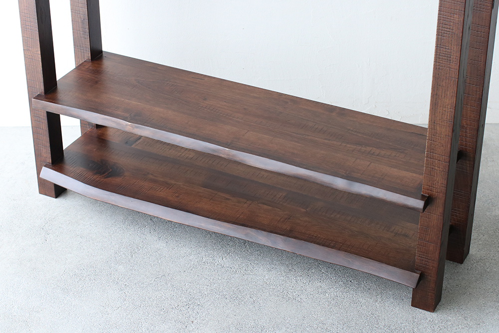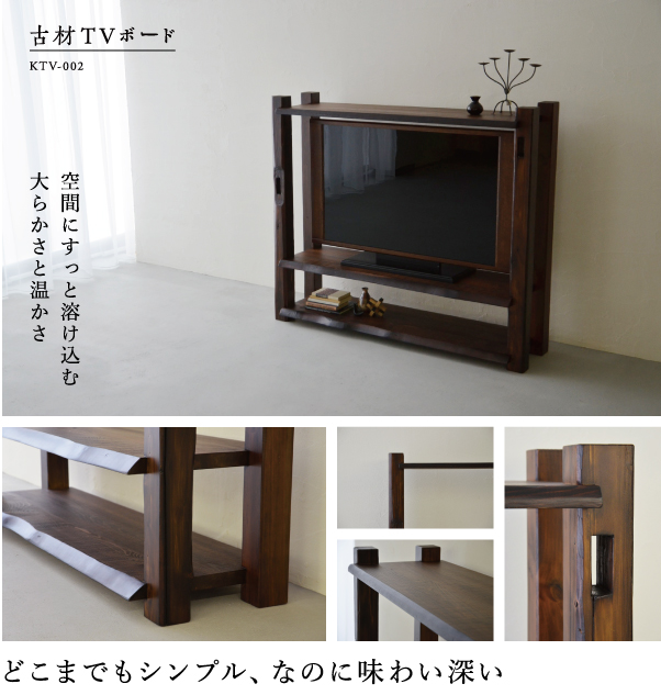 森の中に置いても溶け込みそうなくらいシンプルで自然な風合いに満ちたテレビボード。飾り物や本などをさりげなく置いて、“魅せる収納”を楽しむのも素敵。柱のところどころに見える古い窪みや穴は、柱と柱を組んでいた古民家の名残。真新しい木材には持ち得ない古材ならではの味わいが、空間に豊かさをもたらします。