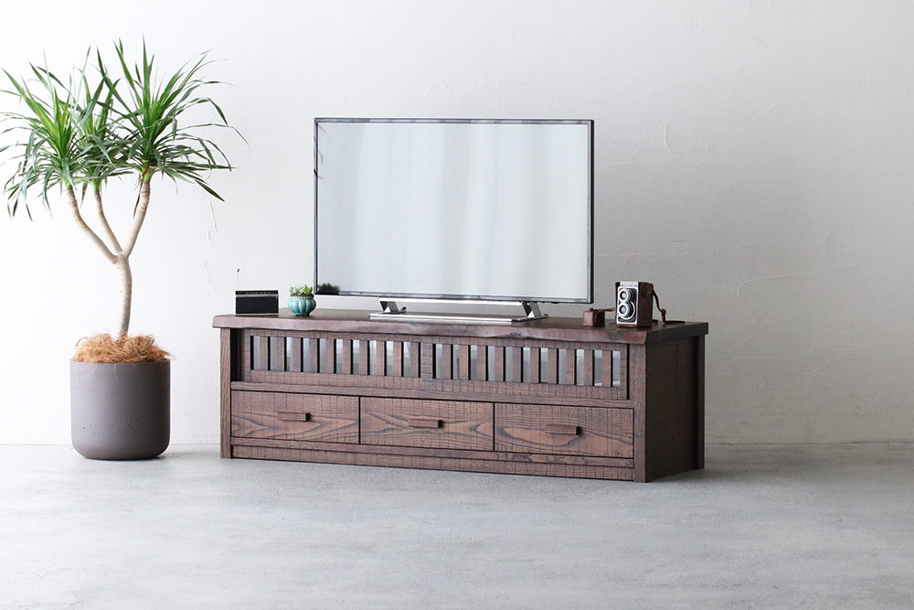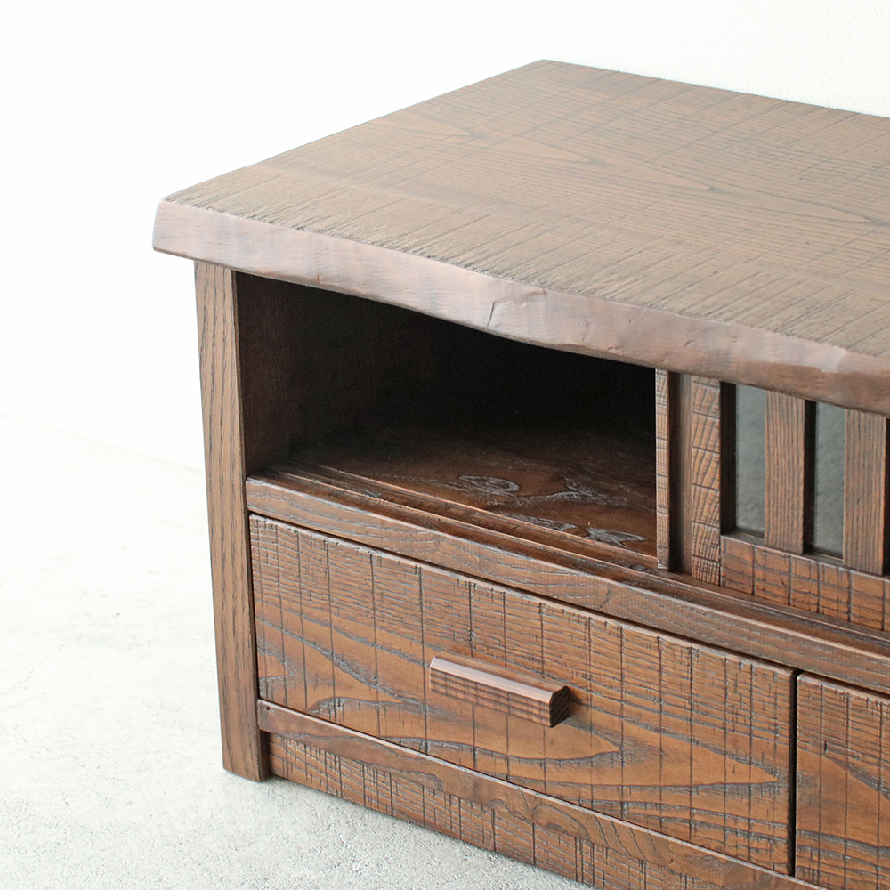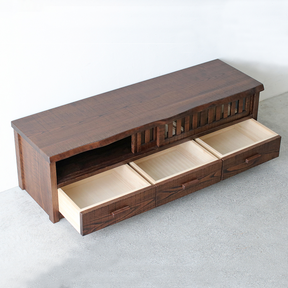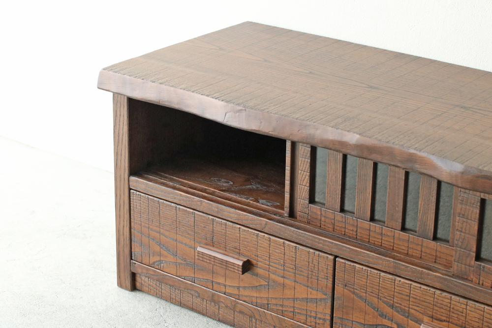 分厚い天板と側板でがっちり土台を固めたTVボードは、大型テレビはもちろん、ステレオなどを並べて置いても動じない安定感のある設計です。1本1本丁寧に組んだ上品な格子戸はガラスをはめてあり、程よく開放的。扉を閉めても外からのリモコンに反応する仕組みで機能面においても優れものです。3つの引き出し内部は、湿気に強い高級材の桐を使用。それぞれ前板は稀少な無垢の一枚板をカットして使用したもの。流麗な木目が自慢です。