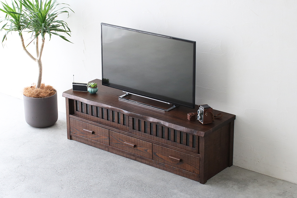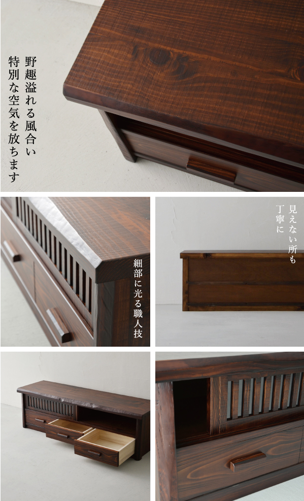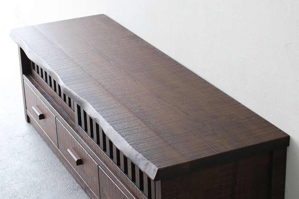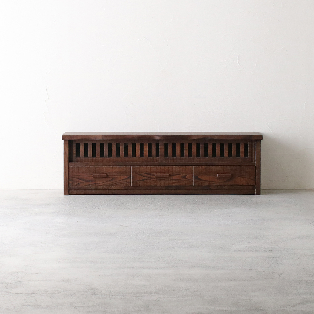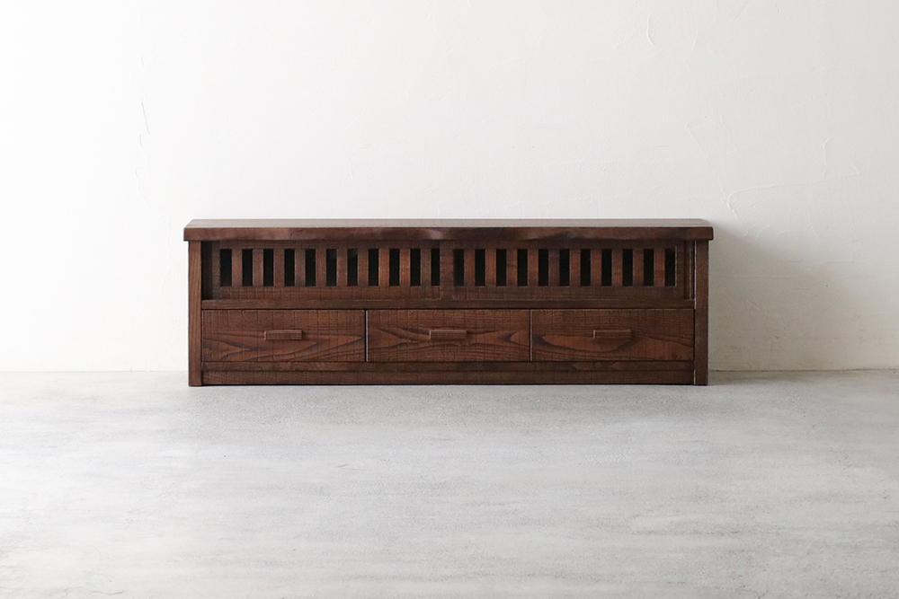 分厚い天板と側板でがっちり土台を固めたTVボードは、大型テレビはもちろん、ステレオなどを並べて置いても動じない安定感のある設計です。1本1本丁寧に組んだ上品な格子戸はガラスをはめてあり、程よく開放的。扉を閉めても外からのリモコンに反応する仕組みで機能面においても優れものです。3つの引き出し内部は、湿気に強い高級材の桐を使用。それぞれ前板は稀少な無垢の一枚板をカットして使用したもの。流麗な木目が自慢です。
