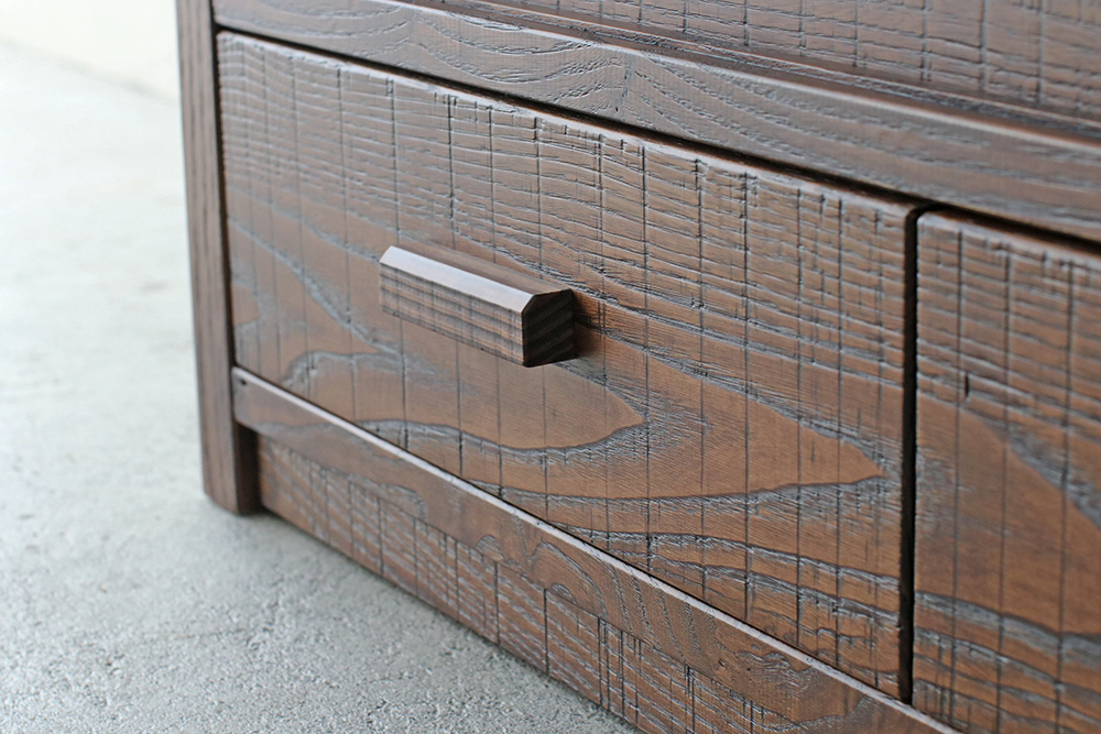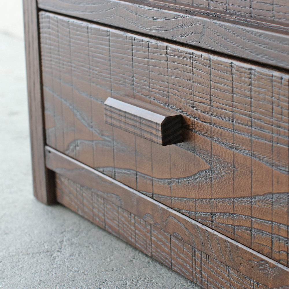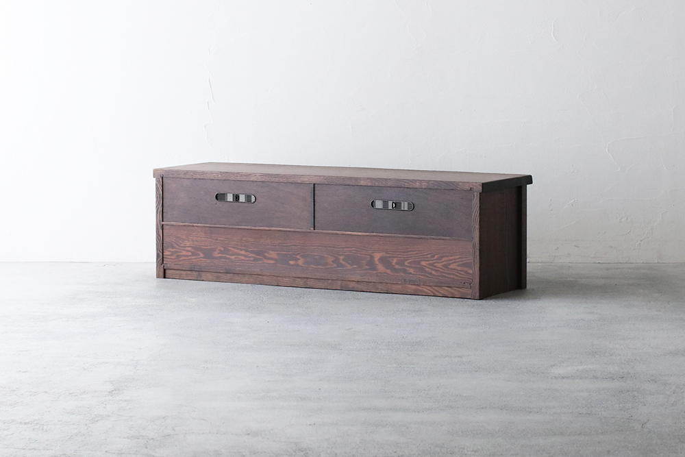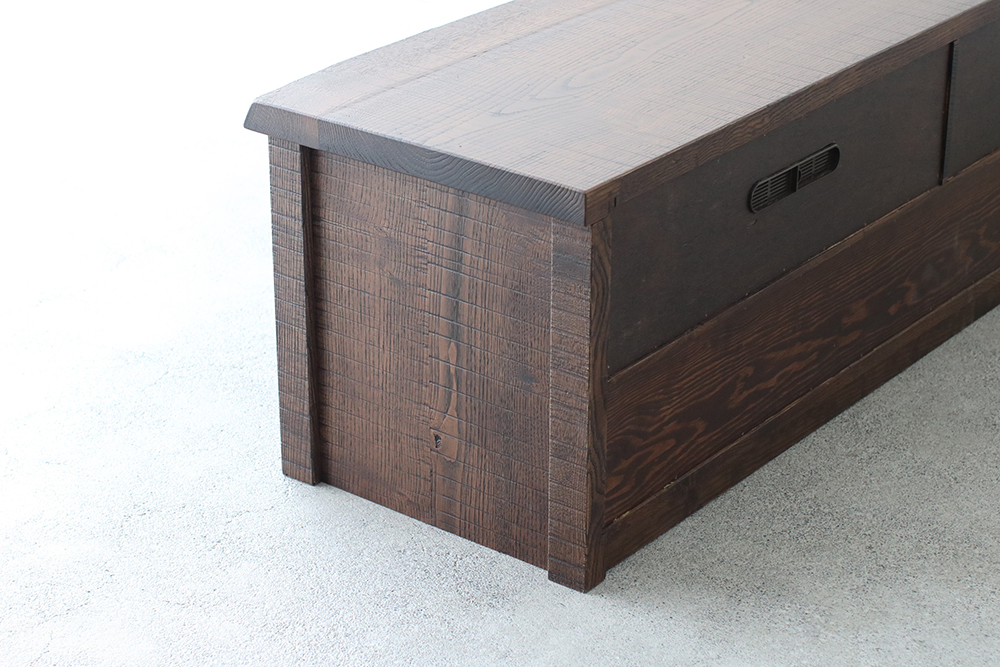 リビング全体は優しい雰囲気なのにテレビだけが浮いてしまう。そんなお部屋は、古材のTVボードで和みの空間へ。天板と側板は分厚い無垢材を使用し、大型テレビを置いても動じません。収納は、上品な格子戸を設えた棚と、内部に桐材を使った引き出しのW収納。引き出しの前板は稀少な無垢の一枚板をカットしたもので、流麗な木目は上質の証です。