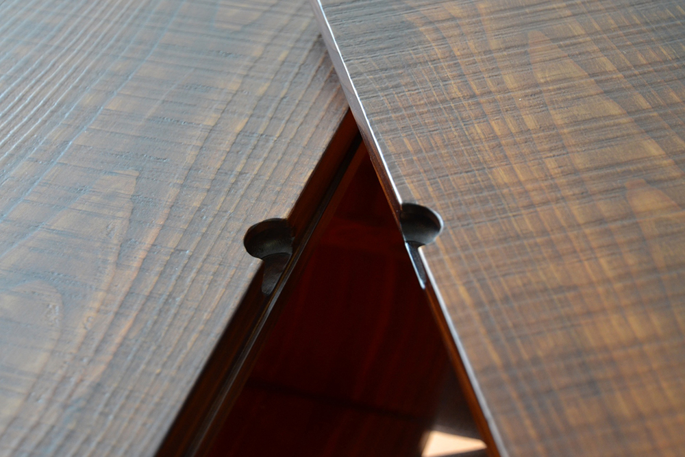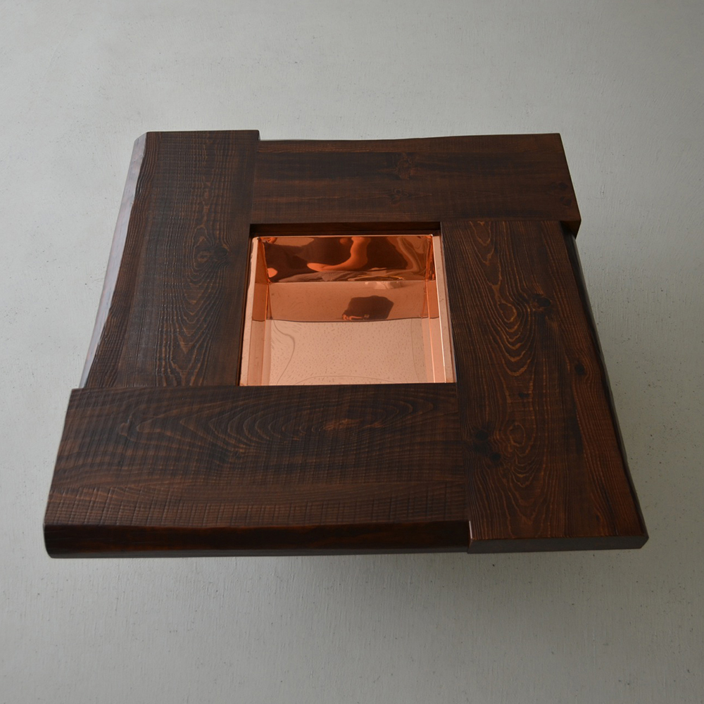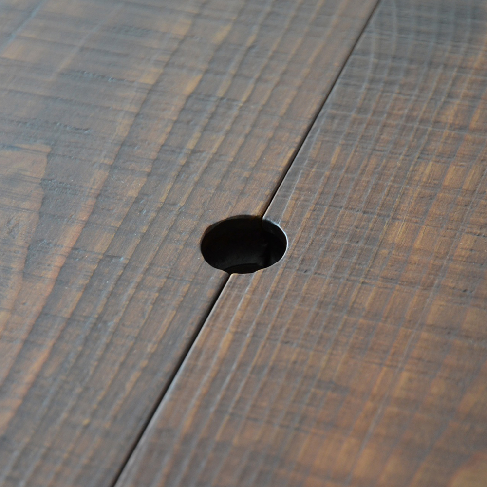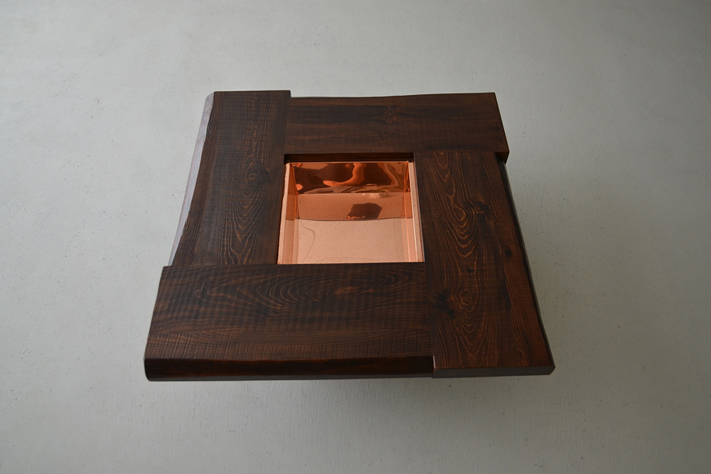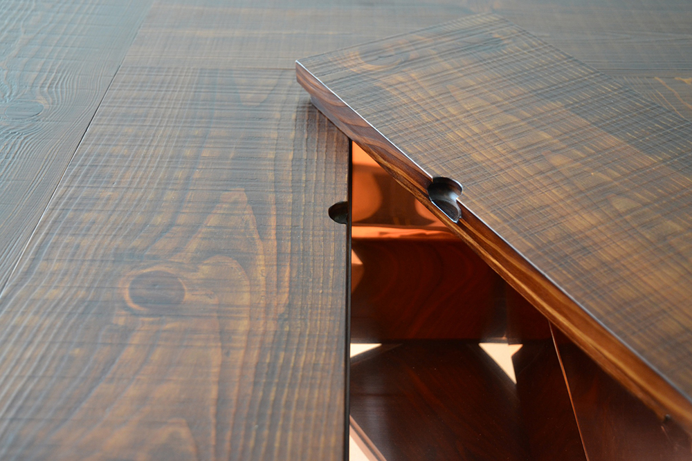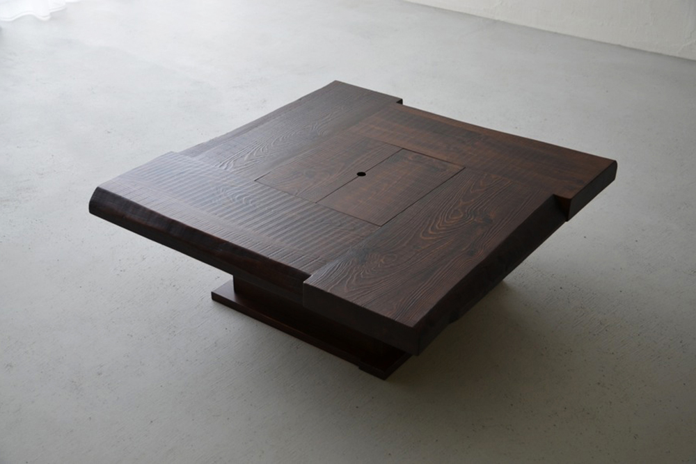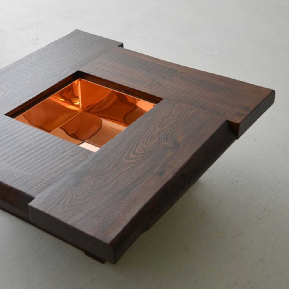 日本の伝統家屋の“火の座”とも呼ばれる囲炉裏が現代風に生まれ変わりました。天板は、厚めの無垢材を贅沢に4枚使用。古材の風合いを随所に生かし、卍型に組んだデザインや微妙な段差が、どことなく昔ながらの囲炉裏を感じさせてくれます。蓋内部の銅板張りは熟練職人の丁寧な手仕事によるもの。もちろん断熱加工済み。灰や炭を入れて本格的な囲炉裏をお楽しみいただけます。 蓋を閉めれば広々、落ち着いた座卓としても活躍。家具調や民芸調のスタイルは数多くありますが、古材を使い、これほどこだわって仕上げた囲炉裏座卓は稀少。心に余韻を残す逸品です。