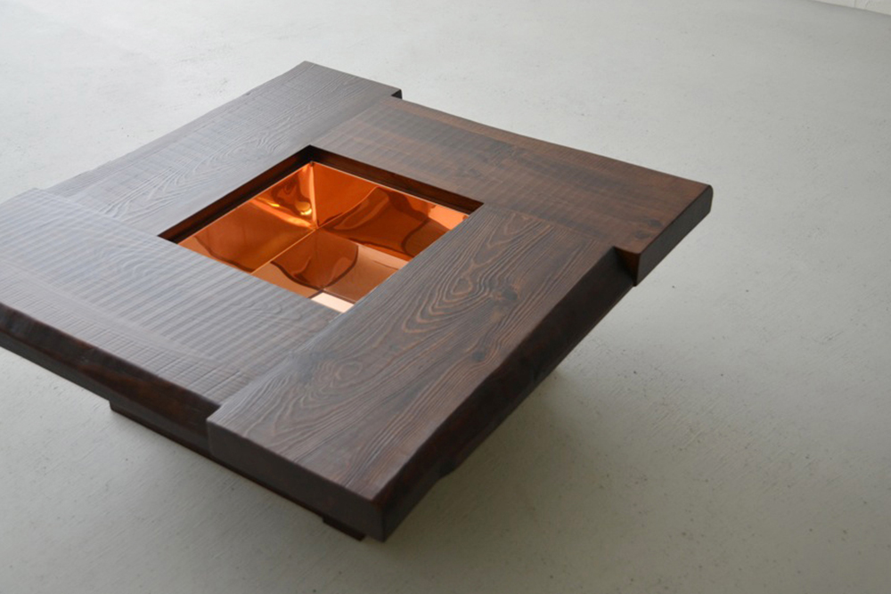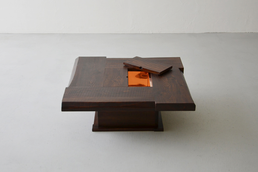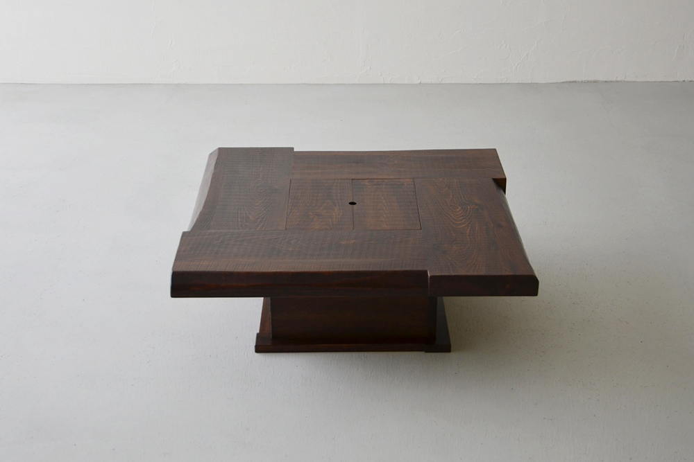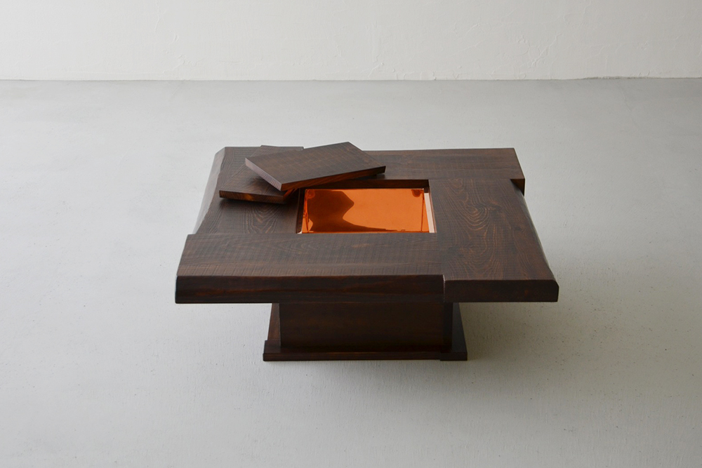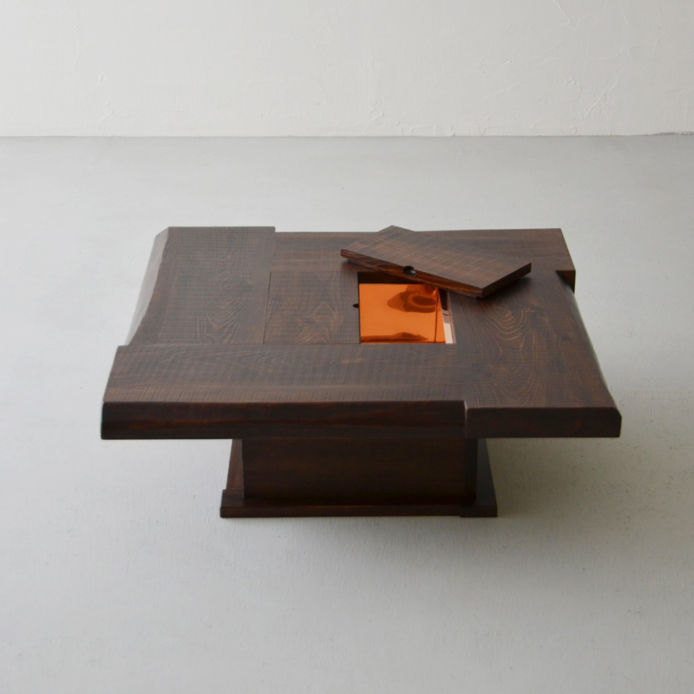 囲炉裏を組み込んだジャパニーズモダンな座卓。木蓋を開ければ、熟練職人の手仕事による銅板張り、断熱加工で昔懐かしい囲炉裏が楽しめます。無垢材を大胆に使用した卍組みの天板は、古民家の囲炉裏を感じさせるデザイン。アツアツの鍋をそのまま置いたり、暖を取ったり、季節の花を飾っても素敵。暮らしの四季を楽しんでみませんか。